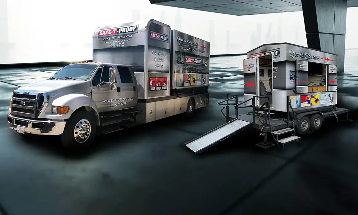 Pioneering Unique Awareness Campaigns: One of the world's first mobile earthquake simulators of its kind, the SAFE-T-PROOF™ Quake Cottage utilizes realistic, intense earthquake-like motion and audio-visual elements to create an immersive experience of being in an earthquake without the danger. A powerful teaching and educational tool, the SAFE-T-PROOF™ Quake Cottage can recreate the duration and intensity of shaking felt by people in parts of Loma Prieta near San Francisco during the 1989 (6.9 magnitude) earthquake or in parts of Los Angeles during the 1994 (6.7 magnitude) earthquake. These “rides,” only last approximately 30 seconds.